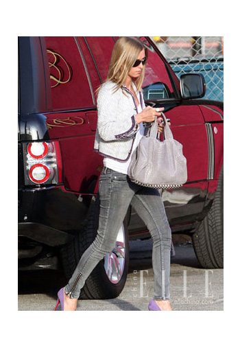 Alex Curran Gerrard with a grey dress collocation of white and purple purse, relaxed feeling is very strong, bag bottom rivet increased popular feeling, to dress up more tide stylish rider.